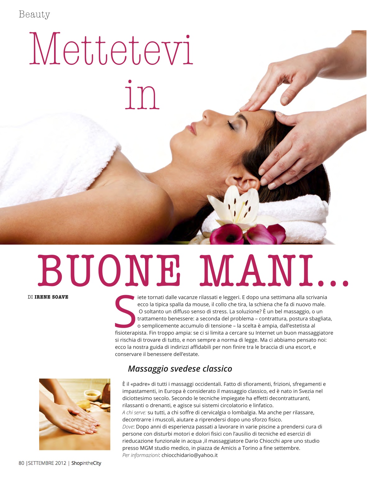 Mettetevi in buone mani…di Serena Rosso | 2012-10-06 Articolo comparso sulla rovista torinese Shop in the city di Settembre 2012. Alla terza pagina dell’articolo ci siamo anche noi professionisti dello Studio di Corso San Maurizio, 15. Share